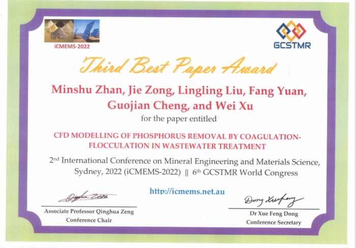 近日,基于公司牵头承担的集团公司2019年度重大科技创新项目《污水处理新型药剂开发及投加量优化控制研究与示范》的“除磷药剂智能投加系统”技术成果完成的《CFD Modelling of Phosphorus Removal by Coagulation-Flocculation in Wastewater Treatment 》论文在第2届矿物工程与材料科学国际会议(The 2nd International Conference on Mineral Engineering and Materials Science, 简称iCMEMS-2022)上获评优秀论文(三等奖)。