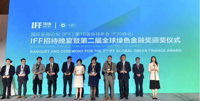 “IFF全球绿色金融创新奖”由具有全球金融领域F20(Finance 20)之称的国际金融论坛(IFF)设立,旨在对全球绿色金融领域,尤其是气候投融资和生物多样性金融方面作出突出成绩的机构,以及创新性解决方案进行表彰和奖励。该奖项评审会由韩国前总理韩升洙、比利时前首相范龙佩、新西兰前总理希普利以及来自全国政协、全国社保基金理事会、联合国环境规划署、世界银行等国内外25位具有全球影响力的重要领导人和金融、环境界精英组成,依据创新性、可推广性、行业贡献度、盈利性和促进公共福祉等评审维度,最终从国内外优选出10家机构获评2021“IFF全球绿色金融创新奖”,包括中国建设银行、渣打银行、中国人民保险集团等世界500强企业。