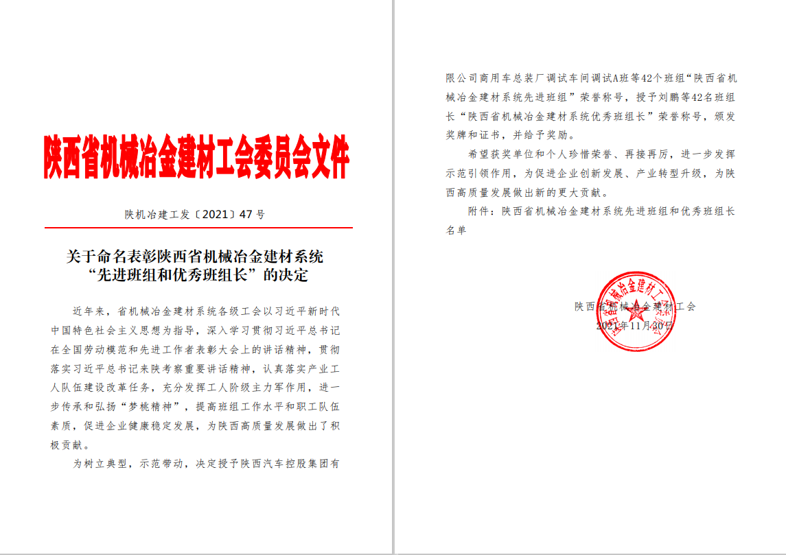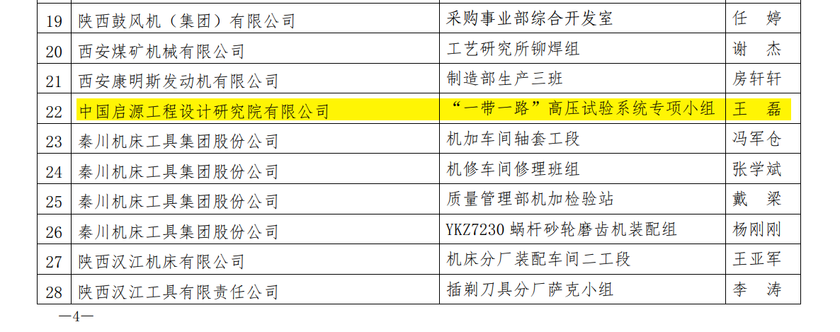 近日,陕西省机械冶金建材工会发布了《关于命名表彰陕西省机械冶金建材系统 “先进班组和优秀班组长”的决定 》(陕机冶建工发〔2021〕47号 )。中国启源“一带一路”高压试验系统专项小组荣获“先进班组”称号,下属启源设计王磊同志被授予“优秀班组长”称号。