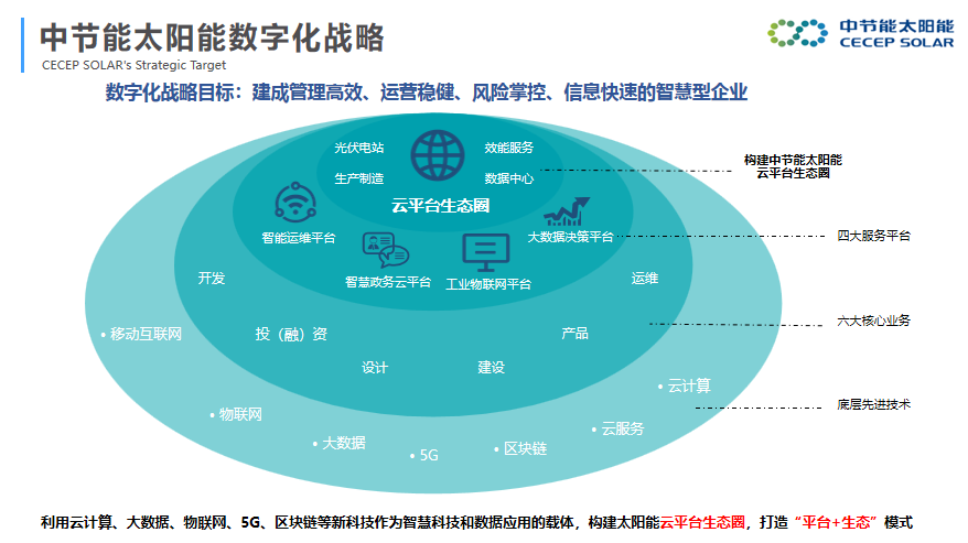 中节能太阳能以智能制造信息化为基础,规划构建了“云平台生态圈”,提供行业级“产品+服务”,实现对内与对外的数字化应用服务与转型输出,从而更好地提供集“硬+软+云+集成+咨询”于一体的智能制造全场景解决方案。