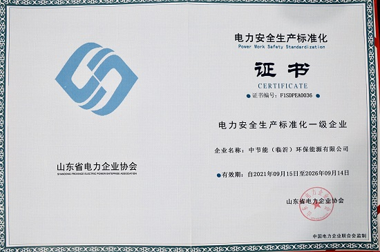 中国环保临沂公司获得山东省电力安全生产标准化一级企业证书