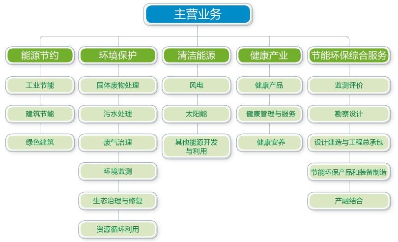 中国节能主业涉及节能、环保、健康、清洁能源及节能环保综合服务(包括相关监测评价、规划咨询、设计建造、工程总承包、运营服务、技术研发、装备制造和产融结合)。目前,中国节能在工业节能、建筑节能、固废处理、污水处理、烟气治理、环境监测、土壤修复、重金属治理、风电、太阳能、新材料、健康产业等多项细分业务领域,规模和实力国内领先。
