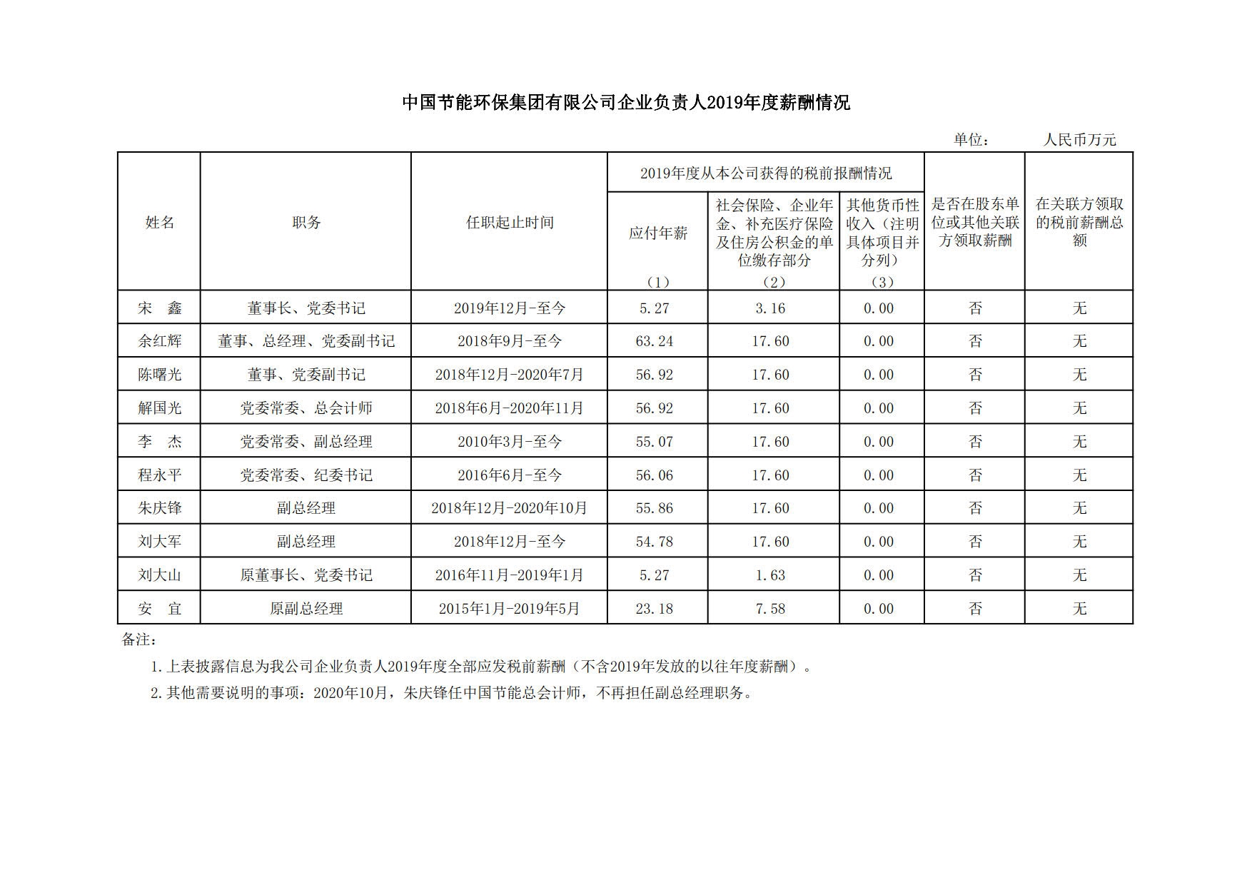 中国节能环保集团公司企业负责人2019年度薪酬情况