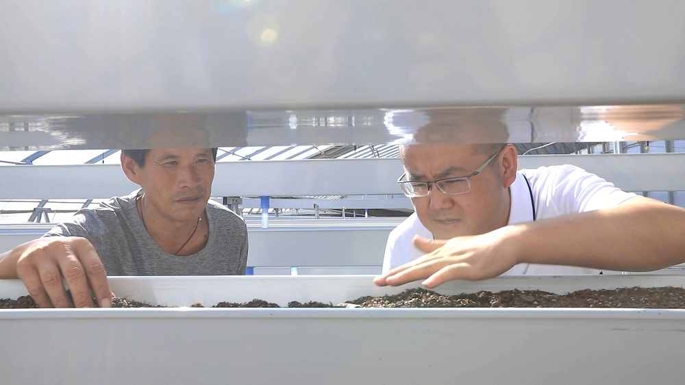 王文涛带着村里致富能手,一起查看水果大棚果苗情况  |