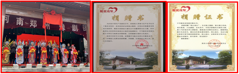 全体团员青年一致表示,要把党的历史学习好、传承好、发扬好、领会好,把学党史、悟思想、办实事、开新局贯穿全过程,努力做到学史明理,强化理论武装;学史增信,坚定理想信念;学史崇德,赓续精神血脉;学史力行,做到知行合一。 真心为民服务 用情用力帮扶在彰显央企担当中助力“靠山吼”发扬光大 中节能实业党委 4月23日,位于豫西深山的嵩县石场村李庄锣鼓喧天、鞭炮齐鸣、人声鼎沸,中节能实业捐建的文化戏台正式落成交付。大戏连演了三天,十里八村的乡民走路赶到村子看戏。“终于盼到这一天了,这下我们的靠山吼(也称靠山簧,豫剧的一种)又可以唱起来啦!感谢共产党,感谢中国节能!”村民王汉强眼睛笑成一条缝,掩饰不住内心的喜悦。
