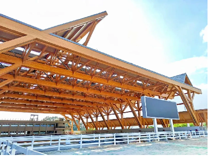 项目整体采用“钢木结合”形式,两侧由钢立柱作为支撑,屋架由钢木桁架组成,屋面以金属屋面板覆盖,木结构材料选用层板胶合木-花旗松规格材,为新型特殊木质材料。