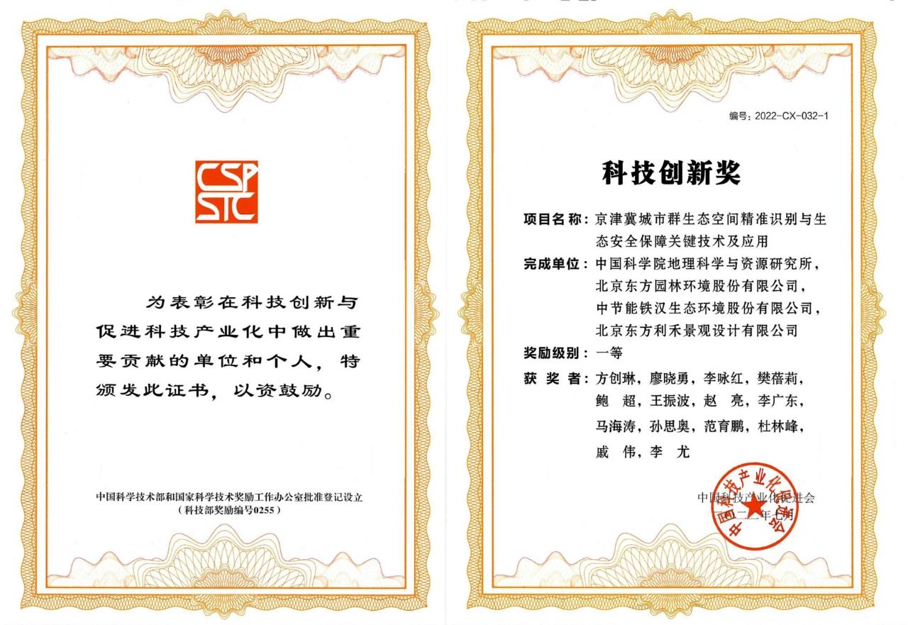 日前,中国科技产业化促进会正式颁发2022年度科技创新奖获奖证书,由中节能铁汉、中国科学院地理科学与资源研究所等单位联合申报的《京津冀城市群生态空间精准识别与生态安全保障技术及应用》项目,荣获2022年度科技创新一等奖。