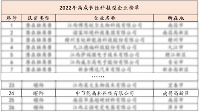 近日,江西省科技厅公布2022年高成长性科技型企业榜单,中节能江西公司下属晶和科技成功入选瞪羚企业榜单。