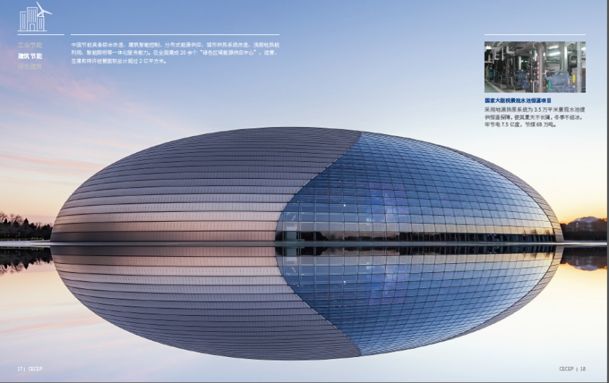 采用地源热泵系统为3.5万平方米景观水池提供恒温保障,年节电7.5亿度,节约标煤68万吨。